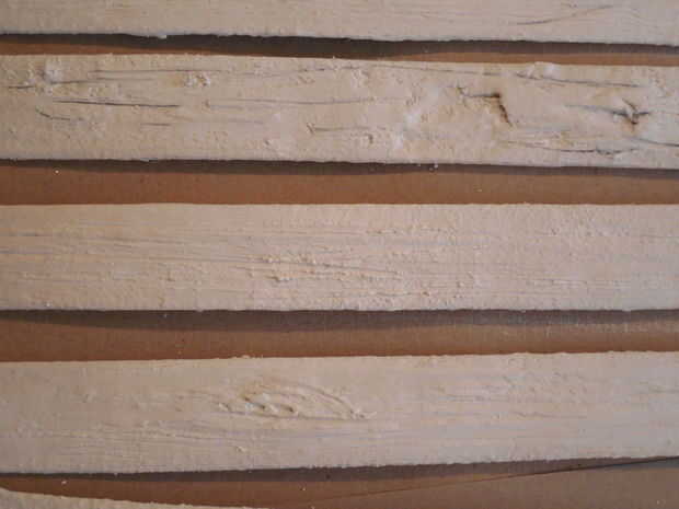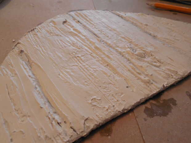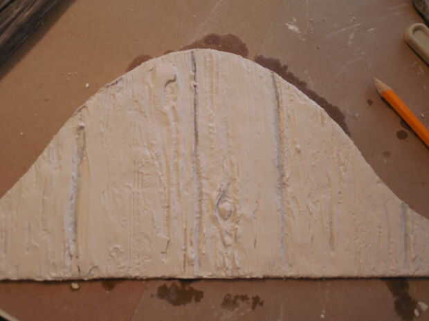 Mantener un viejo tazón de fuente con agua, por lo que puede limpiar tus pinceles o herramientas que están trabajando (no poner cualquier de este yeso o lodo por cualquier desagüe) con un cepillo de chip, empezar a aplicar yeso. Cubrir la pieza, cubriendo a toda la tela. Utilice sus herramientas escriba líneas de tablón de madera, y áreas con nudos etc., este es el mapa pequeño.