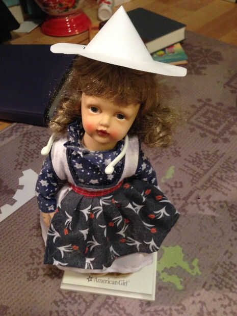 Trazar el círculo, cortar, cortar un agujero para que encaje en la cabeza de la muñeca... usted sabe el taladro. OK, ahora hacer el cono de la cosa de forma de sol, pero dejarlo como un cono. Uso el pegamento grifos para colocar para el borde, y... SÍ, SOMBRERO DE LA BRUJA!!!