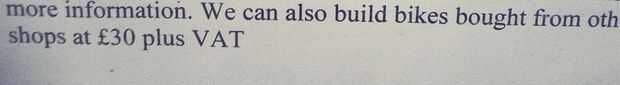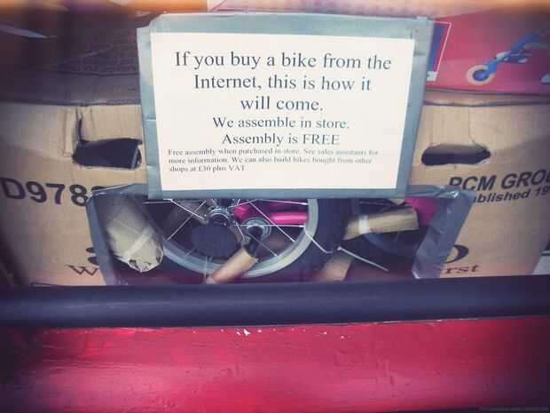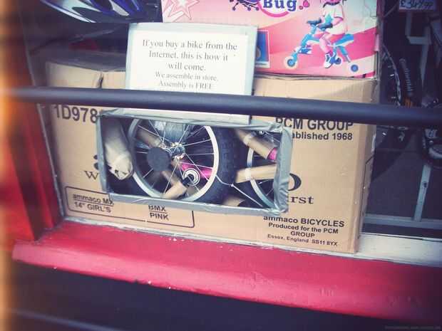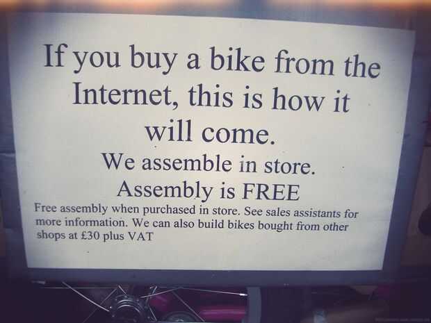 Iba pasando una tienda de bicicletas y vi este pedazo inteligente de publicidad señalando lo difícil que es montar una bicicleta en línea.