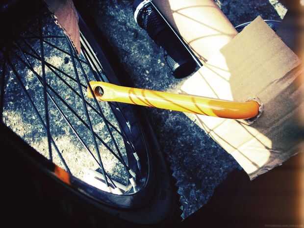 Tire de la rueda delantera suavemente lejos de la moto; contará con la manivela a través de sus rayos tan sepárela esto.