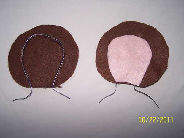 Cortar dos trozos de alambre y doblarlas para que la forma general de brown sentía. Asegúrese de dejar alambre a cada lado de la oreja, como se muestra en la imagen. Pegamento caliente el alambre en su lugar. Voltee la oreja marrón y caliente pegamento la rosa fieltro marrón, alineando los bordes del planos.