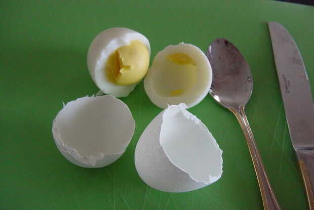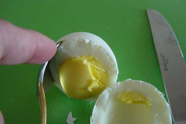 Inserte la punta de la cuchara entre el huevo y la cáscara, ejecutando la cuchara alrededor de la cáscara para aflojar. Sacar el huevo.