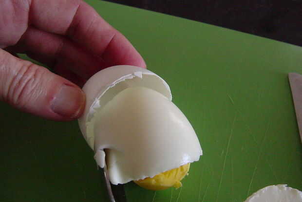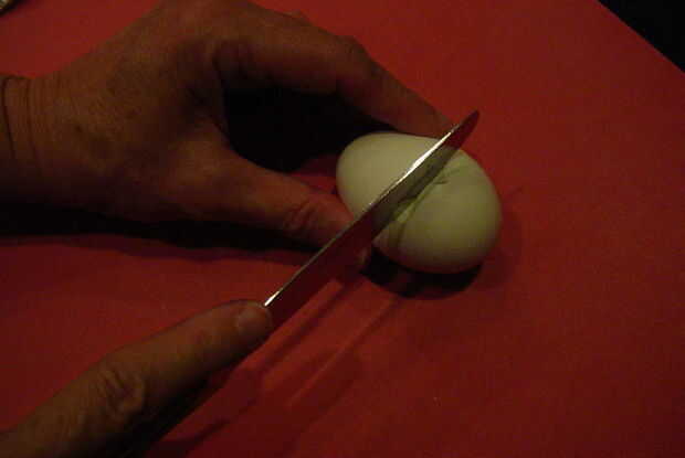 Huelga el huevo con el cuchillo haciendo un "corte" en la cáscara.