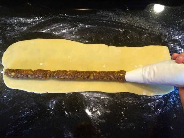 Para el relleno, encontré que usando una manga pastelera me dio los mejores resultados. Transferí el higo relleno en una manga pastelera, luego una vez terminé usa, podría fácilmente almacenarlo en el refrigerador entre usos. Si no tienes una manga pastelera, no se preocupe! Sólo use una cuchara y tratar de conseguir una bonita, incluso registro de relleno en la masa. Que funciona igual de bien.