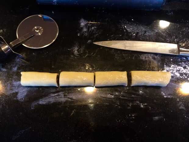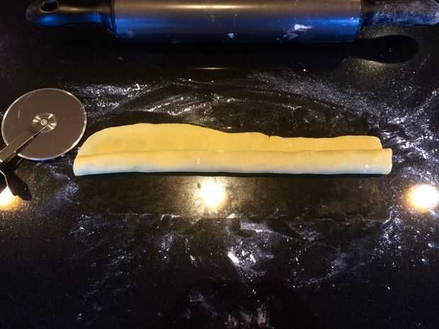 Enrollar la masa de hojaldre en la parte inferior y sobre el relleno. Rollo el registro ligeramente para que la masa se superpone ligeramente sobre el otro lado. Cortar el resto de la masa con un cortador de pizza o un cuchillo