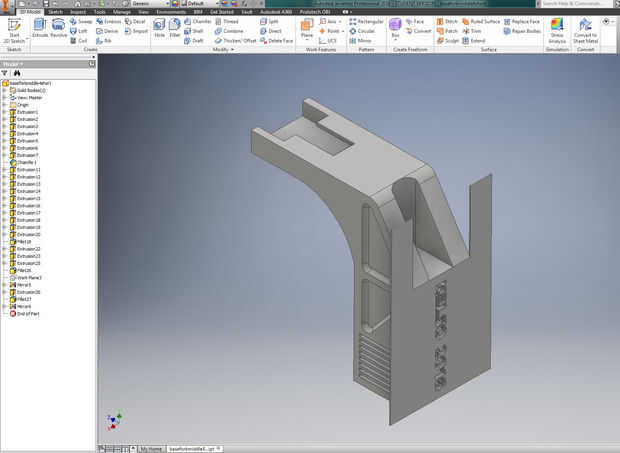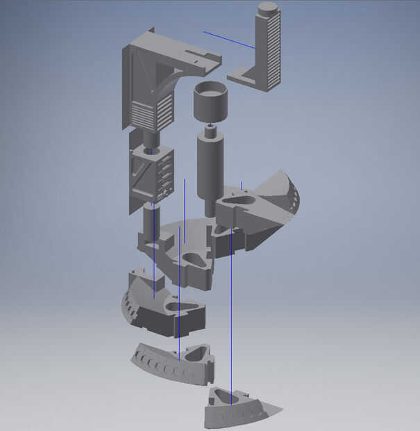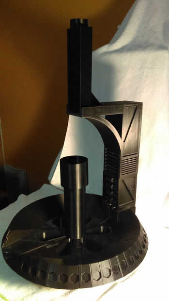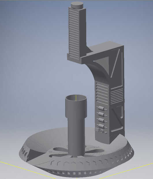 Cuando Sideshow Collectibles salieron con el busto de Darth Vader tamaño producían solamente 300 de ellos con los soportes del casco. Yo no era uno de los afortunados para poder conseguir una versión exclusiva con el stand mientras estaban todavía disponibles, pero yo ordené una versión normal sin el soporte. Esto fue un poco decepcionante porque los cascos deben sentarse en una mesa, ocupan mucho espacio y no se ven bien sentados allí con ningún soporte. Entonces, cuando tomé una clase de gráficos de Ingeniería Universidad de mi comunidad local solía esta oportunidad de crear un soporte personalizado para mí. Utilizando Autodesk Inventor, una cinta métrica y un micrómetro podido idear un diseño para adaptarse a las especificaciones de mis cascos. Comenzó con la base y había creado sólo una astilla de 1 pulgada de él, luego girar esa astilla para crear una forma de base circular. Desde corte las piezas en el frente donde el casco se sentaría y creado unos agujeros más en el medio. Ya que la impresora sólo crearía 8 "x 8" x 8 "piezas, luego picado la base en 6 partes de enclavamiento para que encajaría en el área de construcción. A partir de ahí he creado el resto de las piezas que se encajan en la base. No quiero tener que tratar con material de apoyo, así que diseñé todo para poder imprimir sin él. El primero de ellos que lo imprimí tenía algunos problemas con las piezas no encaje así que tuve que hacer un montón de presentación abajo del plástico para conseguir todo para trabajar. Con el tiempo hizo un montón de ajustes en el diseño, afinando las tolerancias y dimensiones de ajuste para que todo ajuste justo. La primera de ellas imprimí en la escuela en una imprenta comercial que crea material de apoyo que disuelto en agua. Cuando llegué a mi propia impresora tuve problemas con algunas de las piezas más grandes deformaciones de la cama de impresión así que añadido protuberancias planas durante mucho tiempo a algunas de las partes para que las piezas podrían ser físicamente reprimieron a la cama mientras que impresión y esto solucionó el problema de la deformación. Luego las protuberancias planas están cortadas más adelante y la parte está clasificada para quitar los bordes ásperos. Se muestra un gancho agarrador de la pantalla de uno de los modelos con estas protuberancias. Comencé vendiendo estos soportes a otros coleccionistas y un cliente me dijo que deseaba el casco superior se sentó más bajo más como Sideshow soporte exclusivo hace creó una versión se sienta inferior y venden como una opción. Todas las piezas encajan junto con sin necesidad de pegamento u otros sujetadores.