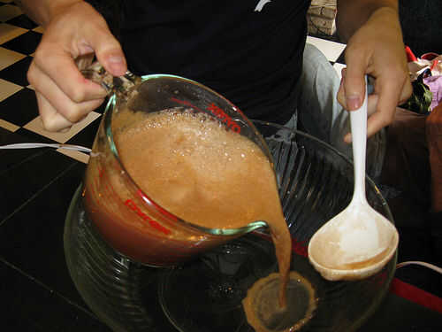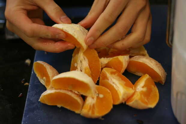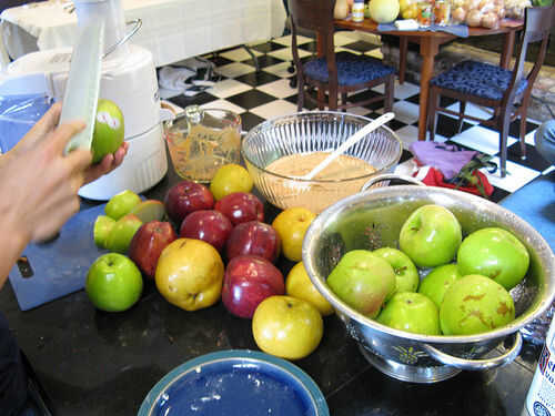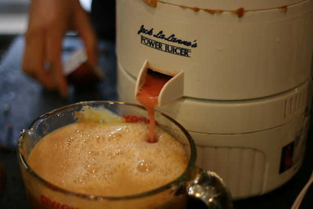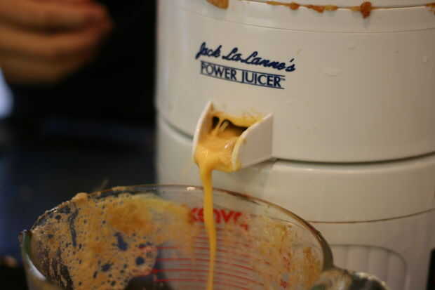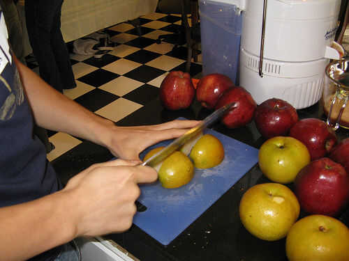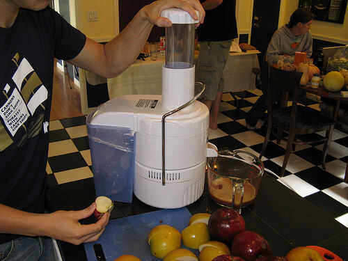 Si no tienes un extractor de jugos, este paso será un poco más lentos, pero todavía toneladas de diversión. Sólo lavar las manzanas y luego la base les (no quieres semillas de manzana y su cianuro en su sidra!) Ahora, puede utilizar un procesador de alimentos para los suaves, como salsa de manzana puré. Luego, vierta las manzanas hechas puré en un trozo de cañamazo sobre su contenedor, enróllelo para arriba y cuidadosamente, exprimir el jugo en el recipiente de abajo. Las naranjas y limones se pueden jugo a mano con un exprimidor de cítricos u otro juicer de la mano.