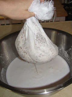 que encontré en Google puede ayudar a explicar). - Suavemente gire o presione desde la parte superior a la parte inferior de la tela para que el jugo gotea hacia fuera dentro de la jarra. (Si apretar demasiado, se te chorro de pulpa dentro de la jarra. Está bien, que se puede repetir este proceso para volver a filtrar si no te gusta la pasta).