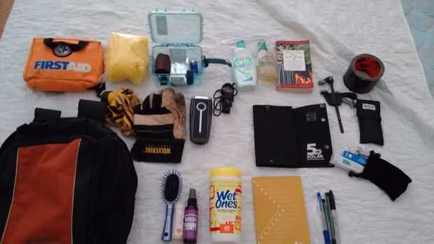 - Salud y seguridad- Kit de primeros auxilios, como limpiador de manos bien asincluding (toallitas y líquido, que tienen diverso valor polivalente), protector solar y bug spray (en bolsa zip lock en caso que escape) y un silbato u otro dispositivo de ruido