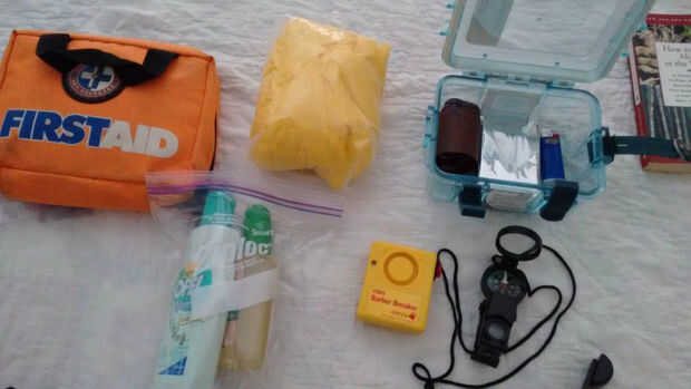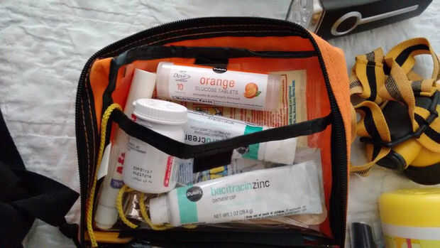No voy a detallar todos los elementos que deberían estar en su botiquín de primeros auxilios. La Cruz Roja Americana tiene una gran orientación sobre el tema en su página web. Asegúrese de tomar en consideración las condiciones especiales de salud existentes como diabetes, alergias, presión arterial alta o baja, etc. y para su equipo por consiguiente. Tenemos el cuchillo del ejército suizo en el botiquín de primeros auxilios porque tiene tijeras y otros artículos que pueden ser útiles allí.