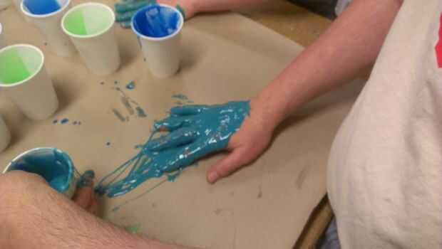 Poner un cuadrado de 2 pies de papel de estraza marrón hacia abajo sobre una mesa para que no estropear la mesa durante este proceso. Coloque su mano firmemente en el papel y utilizar un palito para aplique "belleza", una capa fina a la mano. Le permitirá recoger todo el detalle. Una vez en la primera capa, unte el resto en que su mano está cubierta.