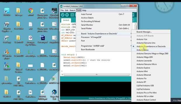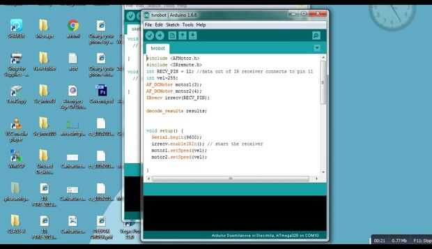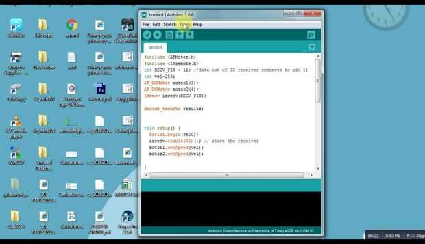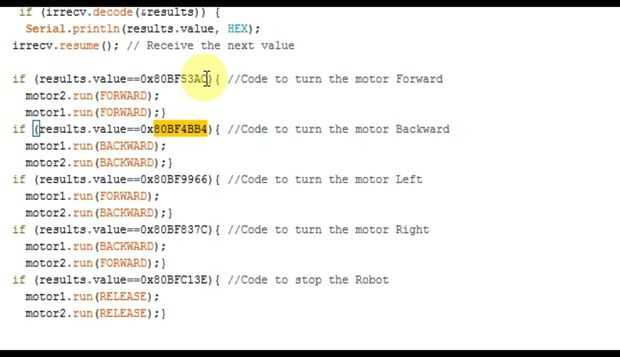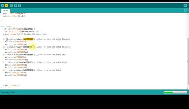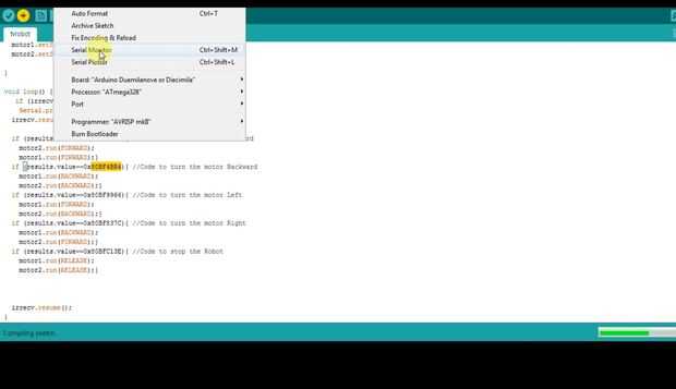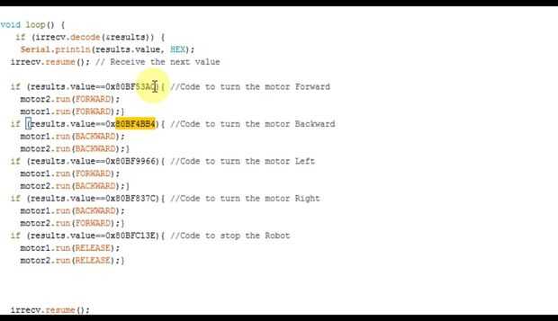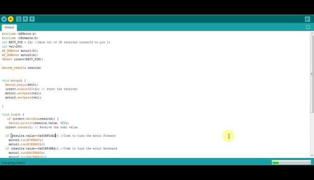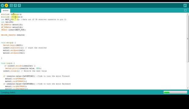 Para cargar el código principal sólo tienes que seguir el mismo pasos como se ha hecho pero esta vez necesita copiar valor de cinco clave en el código. Ahora también necesita una biblioteca más que se puede descargar desde el paso de descarga. Con la ayuda de vel entero en el código puede cambiar la velocidad de tu Robot cambiando a cualquier valor entre 1 y 255 para la velocidad deseada. También puede modificar este código para que tenga más motores que controlan diferentes funciones en su Robot. También puede utilizar este código con otro escudo para automatizar cosas como pulsar teclas específicas del control remoto de tu TV en un patrón específico para abrir su Motor Control cerradura de puerta o incluso automatizar tu casa con un escudo de relé por lo que puede cosas de encendido/apagado con el mando a distancia TV incluso sin levantarse de su lugar.