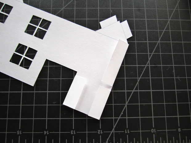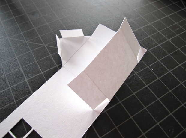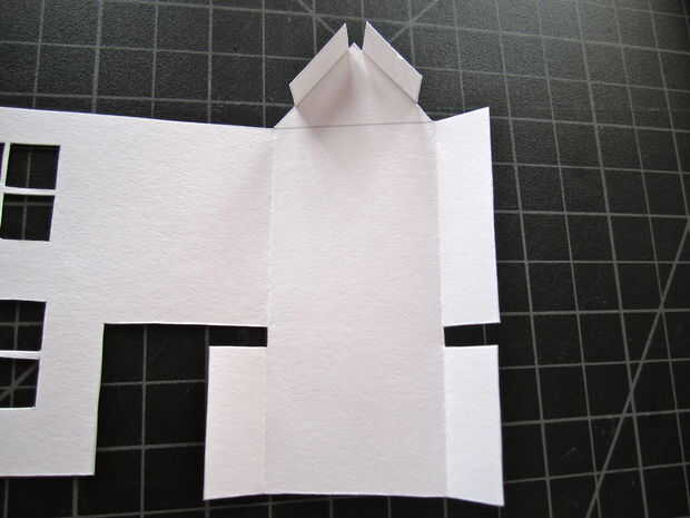 Pliegan las tres pestañas como se muestra en la primera foto y luego las dos pestañas pequeñas en la parte superior. Luego a doblar sobre la pieza final, utilizando el pliegue en la pestaña de la parte inferior izquierda y el extremo de la cubierta como sus pautas.