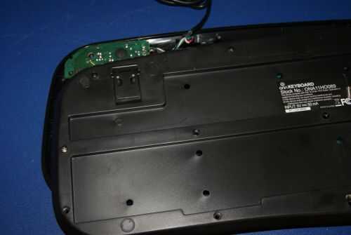 Ahora quitar todos los tornillos de la parte inferior del teclado USB (conservarlas para más tarde) con un pequeño destornillador de cabeza Phillips. A menudo uno o dos tornillos se oculta debajo de una etiqueta o etiqueta engomada así que asegúrese de quitar todos. Esto debería permitirle separar la parte superior de la parte inferior del teclado. (No te preocupes si hay docenas de contactos flexibles redondeos pequeño como sólo a descartarlos de todos modos.) Encontrar la placa de circuito impreso (PCB) con los tres LEDs en él y quitar los tornillos que sujetan en su lugar. Separar lo PCB (Foto 2) de las hojas de contacto claves plástico y deseche todo excepto el PCB.