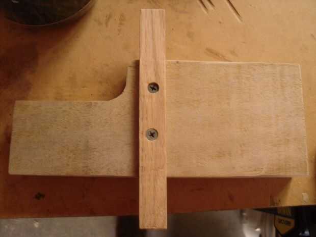 Coloca dos tornillos en el cuerpo de la plantilla, que se sentaba entre las líneas existentes de orificios perforados en el otro lado de la Junta. La posición lateral de la guía de ingletes se encuentra que la cara de corte de la plantilla (marcada en el paso anterior) estaría alineada con la hoja de Sierra de banda. Usé un poco de hueco para que las cabezas de los tornillos estén sentadas más bajo que la superficie de la madera para asegurarse de que no rasguñe la mesa de la Sierra de banda al usar la plantilla.