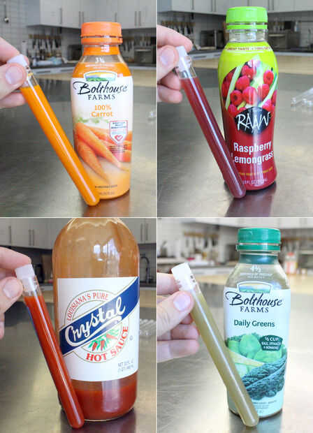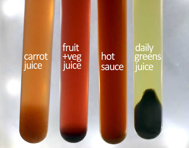 Me hizo girar mis pruebas durante 15 minutos y estaba satisfecho de que se había producido la separación de la densidad. He intentado una variedad de líquidos y otros ingredientes caldosos con sólidos en suspensión. Aquí se muestran jugo de zanahoria, fruta + jugo de verduras, salsa picante y una bebida de salud verde.