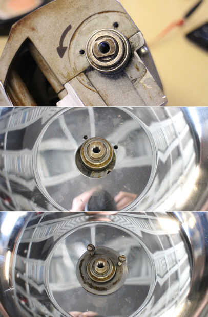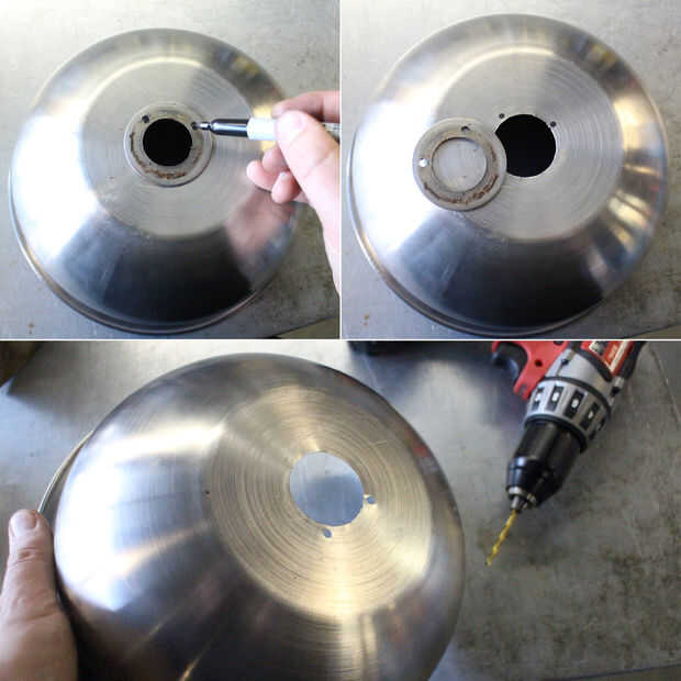 El recinto inferior marcó el centro y había aburrido un agujero más grande que el diámetro del eje de la sierra circular. He guardado el collar protector y tornillos que se ajustan alrededor de eje de la sierra y utilizaron esto como una plantilla de montaje para el tazón de fuente. Usando un marcador transfirió las posiciones de apertura para el bol y taladrar los agujeros correspondientes. El bol podría montar en la sierra y atornillado en su lugar usando el collar protector.