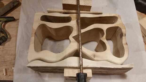 Hice relleno de pegamento de madera y sierras de polvo por lo que correspondería con el color de la caja y pegado los cut-ins para ocultarlos. Cuando sujeta solía el primer corte coincide con la forma de la cara. Esto hace más fácil mantener todo
