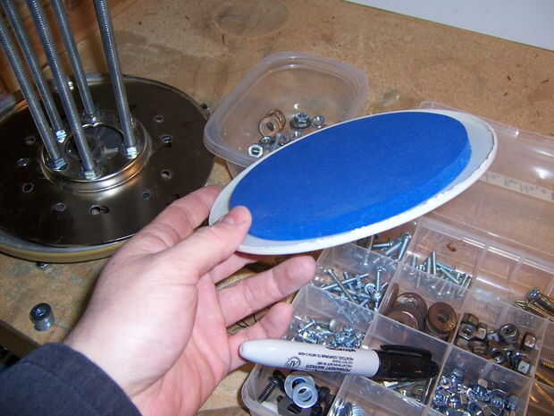 me quitó los bits innecesarios (portada, disco, rueda superior, guías, tabla, etc.) y empecé a pensar en cómo obtener una rueda resistente bonita que uno podría lanzar una olla en adjunta a este mecanismo precioso. Decidí usar los pernos de U en vez de perforar los agujeros de montaje, en caso de que alguna vez quise revertir el proceso y venta de la sierra. He utilizado trozos de espuma dura de algunos muebles móviles sliders para mantener los pernos en U en su lugar y para proporcionar la reducción de la vibración.