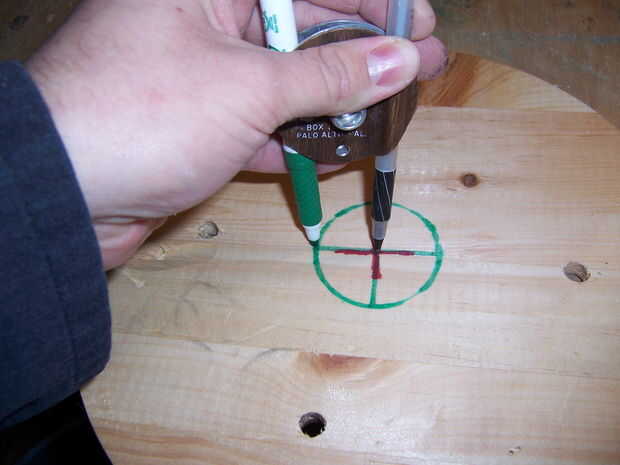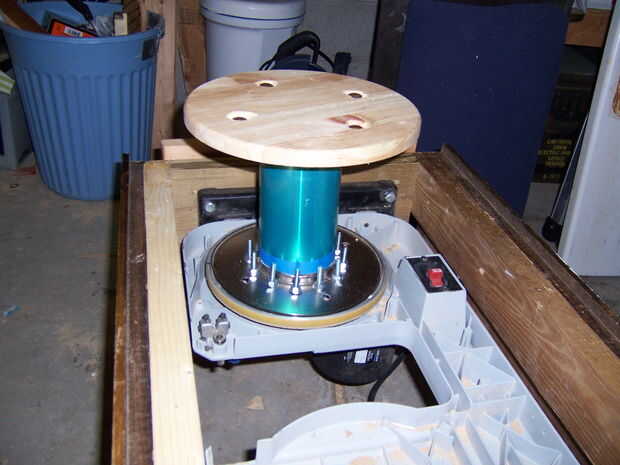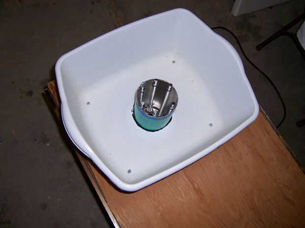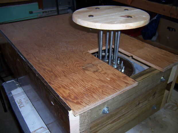 Corté algunos madera de la capa de mi remodelación de cocina para servir como la cubierta y para manejar el funcionamiento corte de agua a 4 en agujero en la parte inferior de un recipiente de plástico y atornillada a la cubierta.