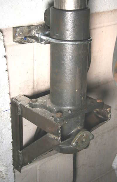 Hice los soportes personalizados que aseguran la sierra a la pared. El esquema de montaje original había incluido el reborde en la base de la columna y un par de tornillos por debajo de ella, que no puede ser visto en las fotos. En cambio, aseguró la columna superior, proporcionando un soporte seguro que minimiza los bamboleos.