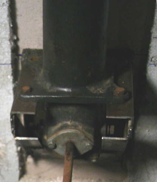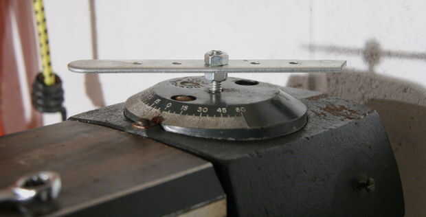 Había montado este sierra contra la pared de mi garaje solo. Mi trabajo de encargo del montaje se realizó con la intención de girar el brazo de la sierra fuera del camino cuando no está en uso. El problema era el eje y manivela para ajustar la altura de la sierra.