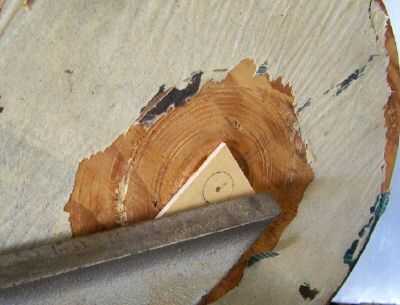 He pegado un trozo de fibra de madera en el centro del disco de madera contrachapada y había marcado el centro mientras que funcionaba el torno. Describen un círculo de 5/8 de pulgada en el desecho de fibra de madera.