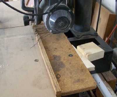 con frecuencia tengo que hacer algo pequeño un grosor exacto. Aquí la pieza de roble debe reducirse en grueso para caber en la corte en las esquinas de juguete de este niño. Es fácil con un tambor de lijar en una sierra de brazo radial y una mesa a