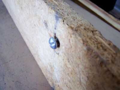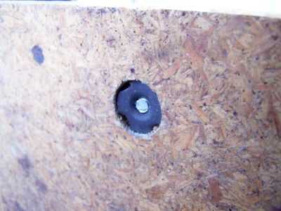 La tabla abrazaderas de presión contra la tabla posterior de tal manera que la tabla trasera tiende a levantar de la mesa de rieles de montaje. Ver las etiquetas en el paso anterior para entender los nombres de las partes. Encajan las tuercas en t en la tabla posterior. 1/4 x 20 cabeza tornillos ajuste a través de la mesa posterior en las tuercas de las Tee, pero son un poco flojos por lo que encajan en las ranuras en el riel de montaje de mesa redonda. Los agujeros para los tornillos deben colocarse para que se alineen con los orificios cuando la guía esté en su lugar. Ver la segunda foto de la cabeza del tornillo. La tercera foto muestra los orificios en el riel de montaje de la mesa.