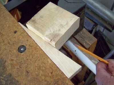 Utiliza una pieza de 2 x 4 para hacer un bloque cuadrado. Una pieza de 1 x 4 también habría funcionado. Con cerca de la sierra en el lugar, mover la tabla posterior contra él. Lugar una de las cuñas contra la tabla posterior por lo que el bloque será cerca del borde puntiagudo de la cuña. Coloque el bloque cuadrado contra la cuña. Sujete el bloque y marque el contorno de uno de los orificios en el riel de montaje de la mesa en la parte inferior del bloque cuadrado.