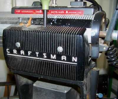 Quitar la parte cubre (piezas de plástico con la palabra "Artesano" en ellos). Derecho bajo el extremo del brazo es una tornillo que mantiene el carro motor de balanceo de la extremidad del brazo de cabeza hexagonal. Elimínela. Cuidadosamente de la horquilla del motor en sus manos mientras se retira del brazo. También puede ser más conveniente desconectar el cable eléctrico que va desde el interruptor al motor. (Los tornillos de la foto no son originales de fábrica. Tampoco lo es el interruptor de encendido/apagado. Mi sierra fue adquirido en 1972). Aflojar la paleta de una cuchara (no visible en la foto) que bloquea la horquilla en posición y desatornille la placa roscada del perno de centro en el carro. Levante el carro del yugo.