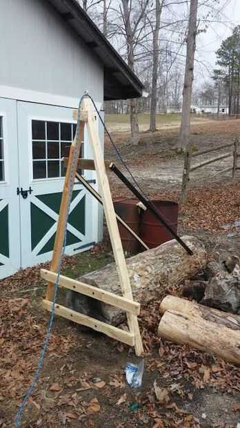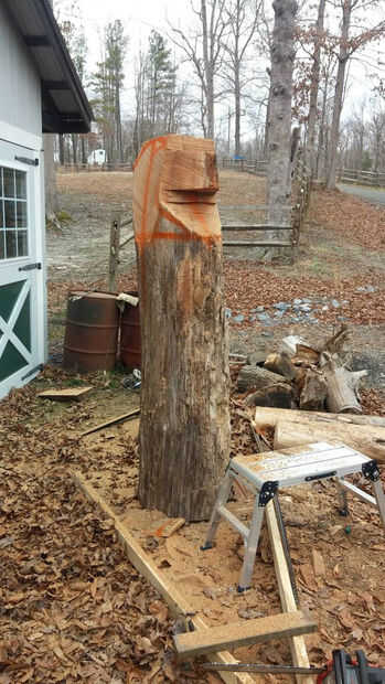 Después de imprimir unas vistas diferentes de cabezas de águila y tenerlos laminado que era tiempo de enfrentar el mayor obstáculo. Cómo te encuentras un 8 pies por 20 pulgadas de roble registro vertical con a maquinaria pesada. Hice una palanca de 2 x 4 que os adjunto en la parte inferior del tronco y luego había atado a una cuerda de mi carro en la parte superior del tronco y lo levantó.