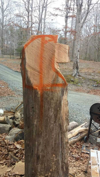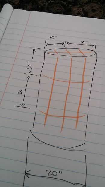 Siguiente plan primer cortes dividiendo el tronco en cuartos. Mi log es 20" diámetro escribir una línea al centro en 10" entonces separar otra vez en 5" adelante hacia atrás y de lado a lado. Luego marqué 10" hacia abajo y 20" por el registro.