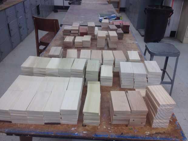 Para mí, este es un buen proyecto para limpiar la tienda y encima de la madera de desecho. Me pre corte piezas de madera 3.5 por 6.5 pulgadas y una variedad de espesores. Corte una variedad de maderas incluyendo madera, maderas duras, maderas exóticas y viejos proyectos de tablero de corte que nunca fueron acabados. It'a una gran oportunidad para los estudiantes a buscar en una variedad de maderas al lado para comparar la textura, grano, color, densidad, etc..