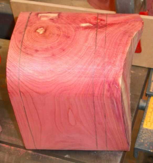Una vez retirado el núcleo necesita hacer tres marcas en él. Usted tendrá que marcar 2 cortes de la losa de la parte delantera curvada de la base y una losa de la parte posterior de la base. La losa exterior tomada desde el frente redondeado de la base del más adelante se convertirá en el tirón del cajón y el marco que rodea el tirón de cajón. La segunda losa de la parte delantera de la base se convertirá en la pared el espacio de almacenamiento que creará más adelante. La losa posterior se convertirá en la parte posterior de la zona de almacenamiento.