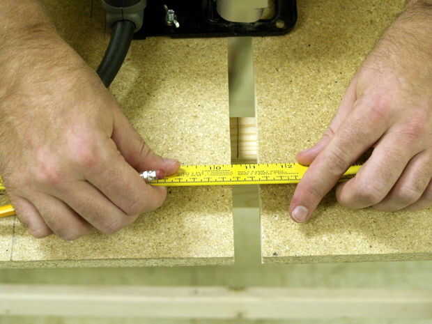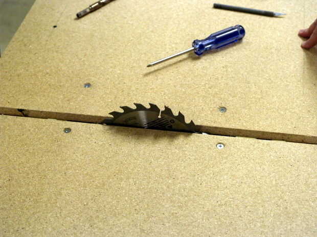 A continuación, necesitamos poner la sierra circular a la superficie de la mesa. Voltear el tablero de la mesa y medir un espacio apropiado (fuimos con 3/4"), luego hacer los agujeros con los agujeros que hemos perforado en la placa de protección como guía.