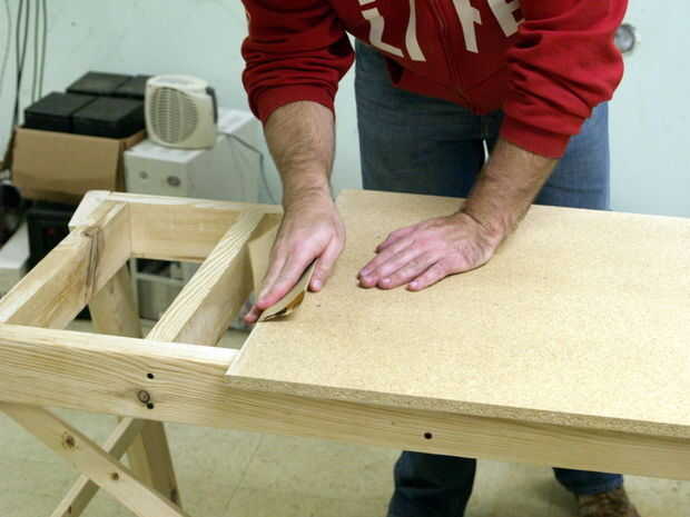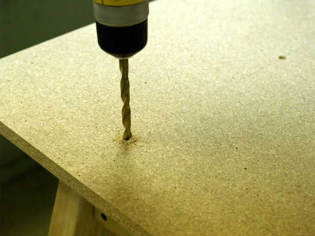Después de esto, volver a voltear el tablero de la mesa y coloque en el lugar correcto. Luego, marque la posición de los tornillos de madera corresponden a la parte inferior del marco, Pretaladre los agujeros, los avellane, y proteger la mesa con tornillos para madera.