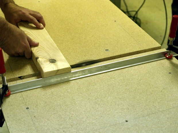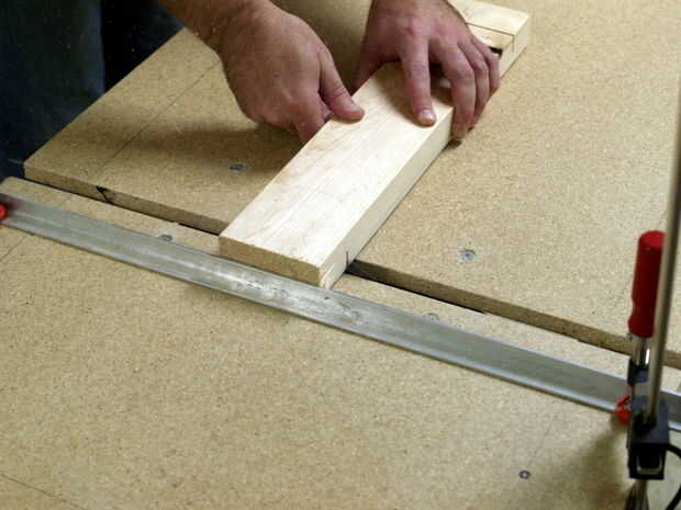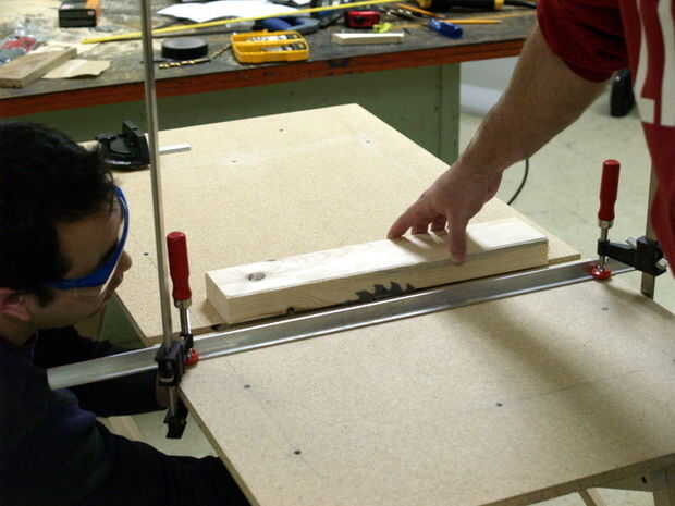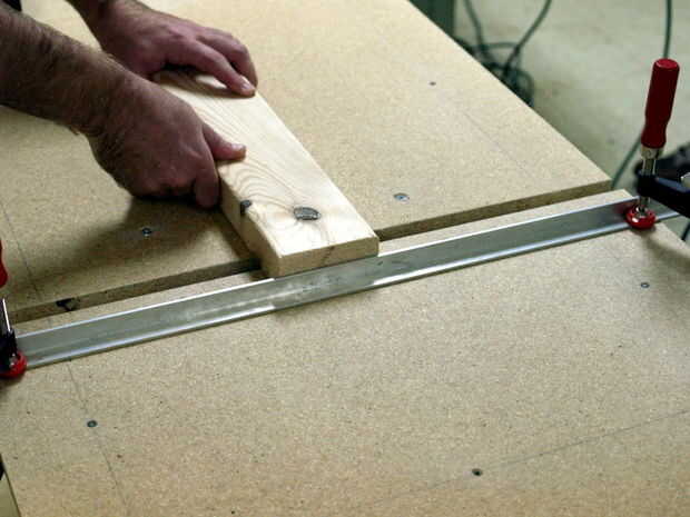 Hemos creado una guía sencilla con un trozo de chatarra ángulo aluminio y algunas abrazaderas de mano, pero fácilmente podría utilizar una pieza de 2 x 4. En el futuro nos gustaría hacer una ranura con un router para permitir el uso de una guía de empuje.