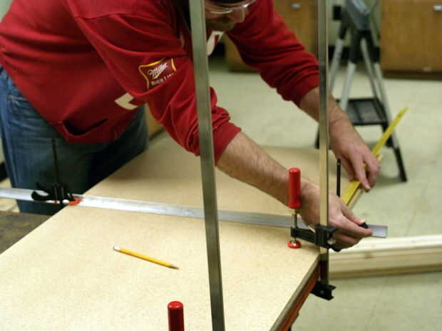 Como se muestra a continuación, nos marcado hacia fuera una longitud de 20" y establecer una guía con un trozo de ángulo aluminio y unas abrazaderas de la mesa. ¿Cortarlo? La sierra circular, por supuesto!