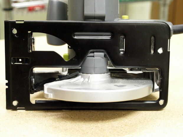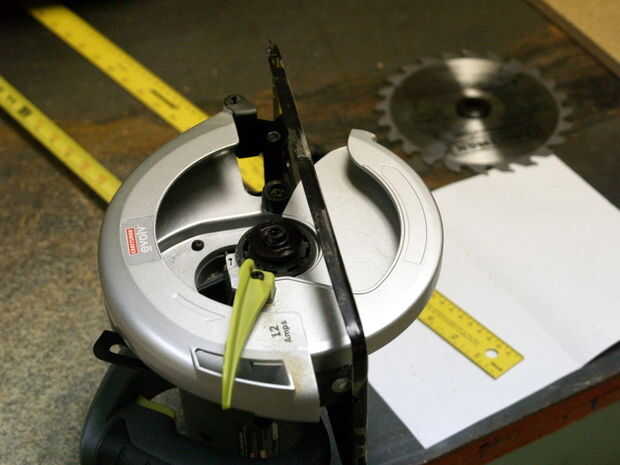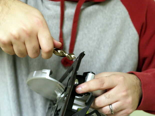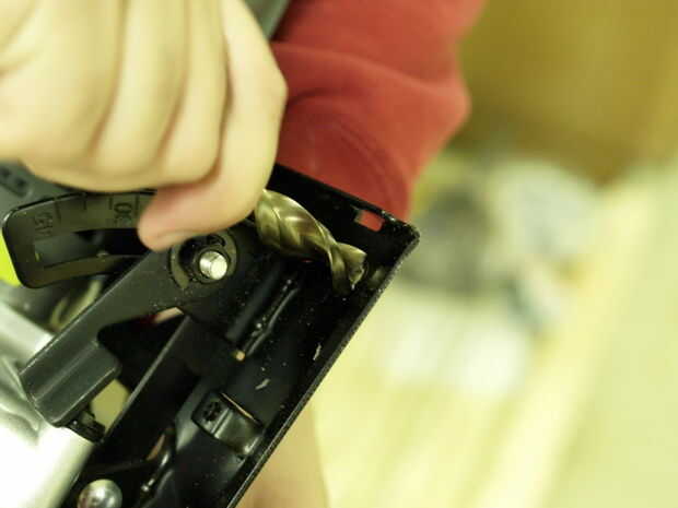 Utilice una 1/4 broca para perforar agujeros en las cuatro esquinas (más o menos) de la placa. Asegúrese de que eliminar las rebabas de los agujeros después de la perforación; no hacerlo podría evitar que la sierra circular sentado al ras contra la parte inferior de la mesa. Si no tienes una herramienta de desbarbado, puede utilizar una broca más grande en su lugar.