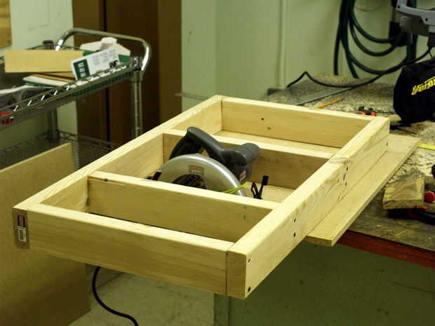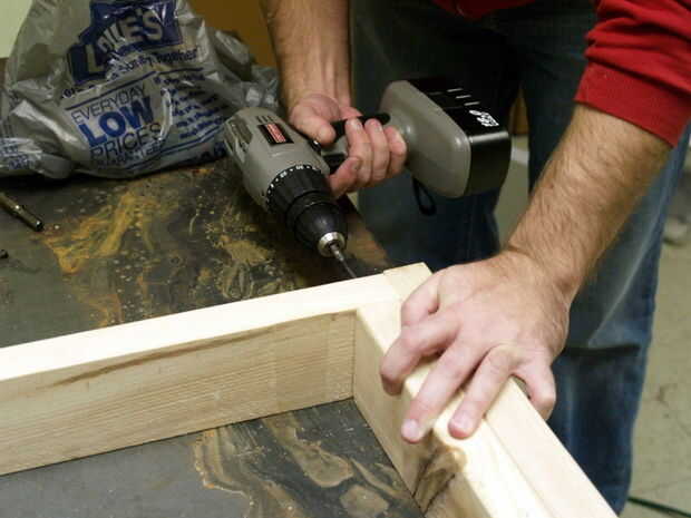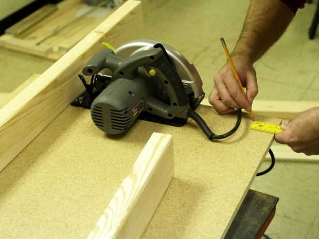 Sólo estamos haciendo un marco de caja simple, así que usted puede o bien separar la circular vio para cortar 2 x 4, o use una sierra de cortar (como lo hicimos). Una vez cortadas la 2 x 4 a longitud, cuadrados hasta el marco externo y algunos agujeros para evitar que los tornillos de partir la madera. Usando un pedazo de madera de desecho para mantener las cosas en línea en el borde exterior puede ser muy útil.