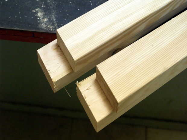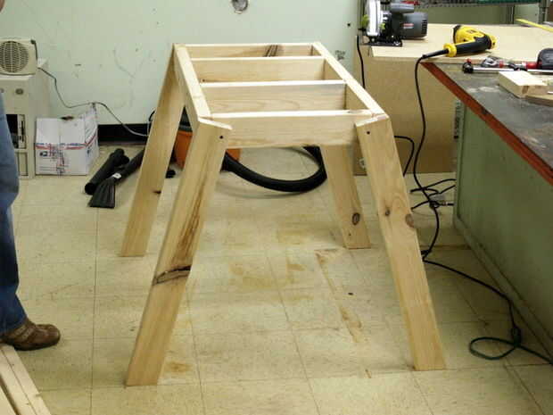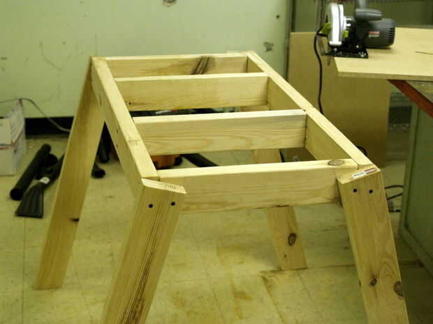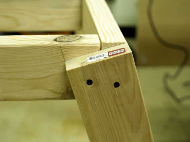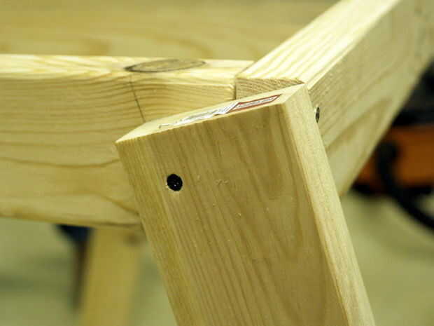 El extremo cuadrado hasta el marco de la línea como se muestra abajo y asegúrelo con un solo tornillo. Repita para las cuatro patas y luego realizar pequeños ajustes hasta que todo esté nivelada. Tiene su amigo mantener todo constante mientras añades un segundo tornillo para cada pierna.