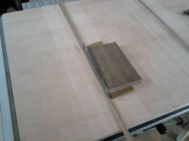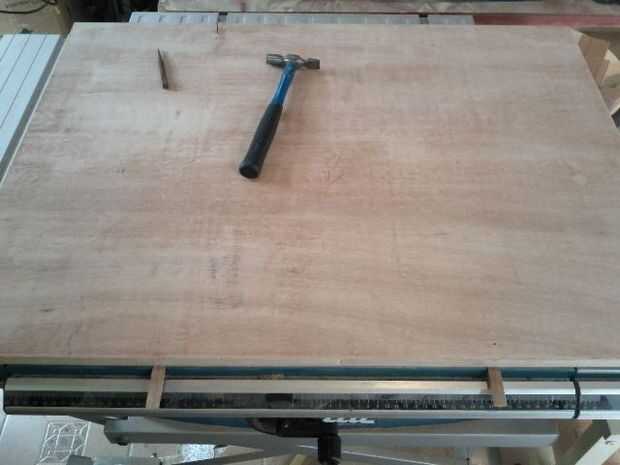 Esto dicho, deje caer las tiras en las vías del mitre. Bajar completamente la hoja. Entonces la Junta en la parte superior y visualmente se alinee con el borde de la TS que está de su lado. Luego tomar algunos pequeños clavos y conduce parcialmente a través de la base y en las guías. El objetivo aquí es sólo garantizar a las guías de posición. Bastarían con dos clavos en cada guía. Estos clavos se eliminarán si ellos son demasiado largos para ser conducido a través de todo el camino. Algunas personas sugieren hacerlo con cinta de doble cara. Las uñas funcionan bien para mí.