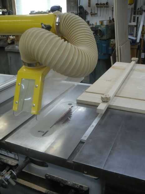 Para resolver el problema, he construido una plantilla, que en la ranura de inglete de la Sierra de mesa y me permite superar las limitaciones de la longitud de mis extensiones de la mesa.