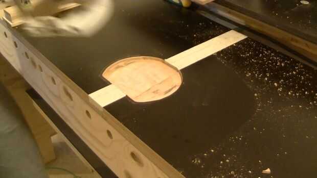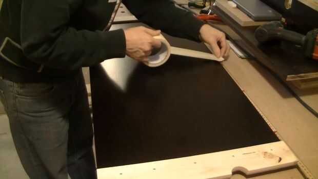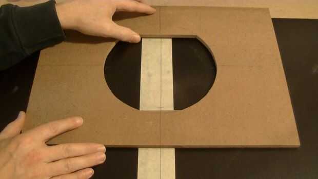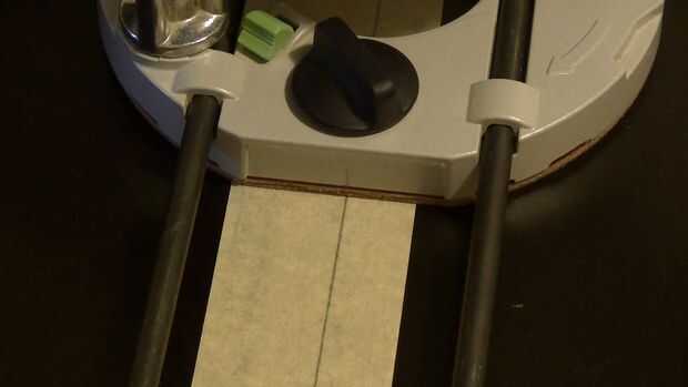 Marcas de lápiz son muy difíciles de ver en madera contrachapada revestida de resina que poner una tira de cinta adhesiva en el tablero. Luego me marca el centro y donde quiero tener el router. La plantilla de router se fija con cinta de doble cara y estoy listo para cortar el rebajo. Porque tengo que quitar 10 mm de madera lo hago en dos pasos.