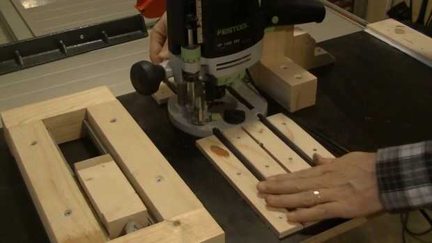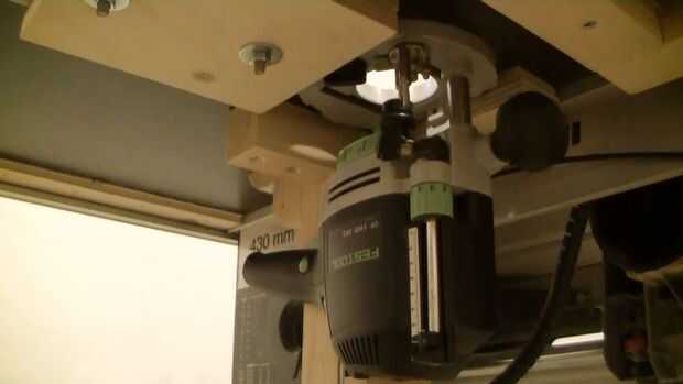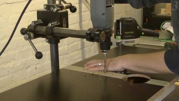Con dos piezas de contrachapado de 19 mm las barras guía se sujetan a la mesa. Por lo tanto que perforar tres 8 mm agujeros todo el camino a través de la tabla y las capas de playwood. Esto hace posible utilizar tornillos de 8 mm para fijar el router.