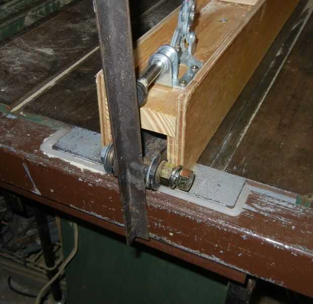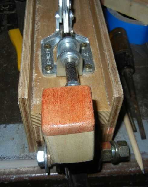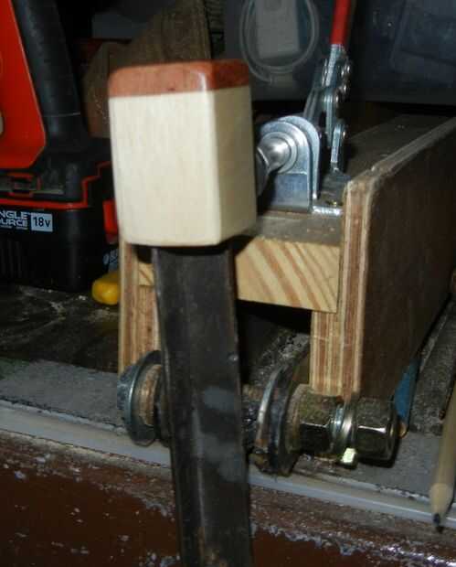 He instalado una palanca que gira en un tornillo a través de los dos cojinetes oilite para sujetar la valla en el lugar. La palanca es un pedazo de ángulo de hierro (debe han seguido me Inicio un día) con un niple de tubería (soldado con autógena (mal) en la parte posterior. El perno atraviesa los cojinetes oilite y el pezón para proporcionar el pivote. Una abrazadera de resorte para permitir la rápida, sin dolor, endurecimiento de la escuadra. Después de usarlo durante unos días he notado el filo superior del hierro de ángulo. Me fabbed un poco la tapa de pedazos de desecho de madera y una tapa de caoba. El toque final.