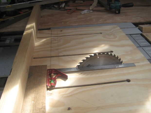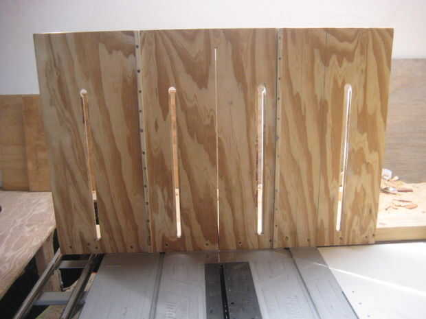 Cuando la pared posterior está encolada, atornillada y seco, coloque los corredores en las ranuras apropiadas en la mesa de la sierra.