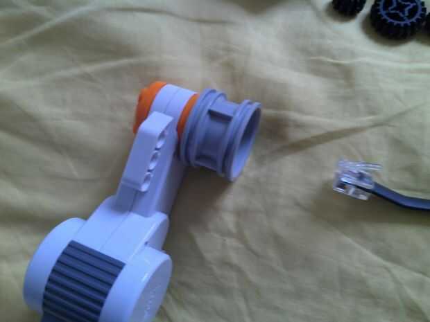 Inserte el eje técnica 5 en el Motor eléctrico Mindstorms NXT. entonces pop en la rueda de 43.2 x 22 sin agujeros, con costillas externas Esto formará el generador de la mano.
