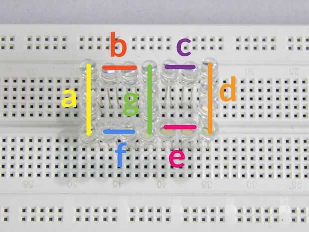 He adjuntado imágenes de cómo he conectado los LEDs en forma de una exhibición de segmento 7. Se han marcado los siete diferentes segmentos a, b, c, d, e, f, g (como siempre). Echa un vistazo a las imágenes de primer plano de LEDs si enfrentas dificultades. Sugiero a partir de un lado del puente de protoboard. Una vez completado el lado, es muy fácil de imitar al otro lado del puente.